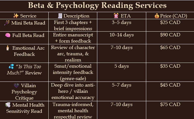 All listed prices for Beta & Psychology Reading Services are baseline rates. Final cost may vary depending on manuscript length, page count, or project complexity. Custom quotes will be provided if additional time, depth, or review scope is required.Digital goods remain fixed price as marked.